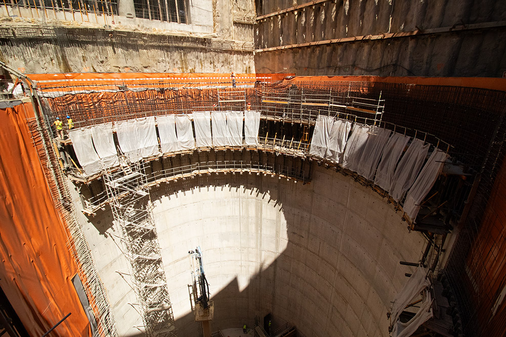 Al no existir espacio para instalar escaleras mecánicas, el acceso a la estación tendrá lugar por medio de ascensores que descenderán 60 m. Durante la obra, el pozo se ha convertido en la vía de acceso tanto de los trabajadores y como de equipos, incluso de los camiones de hormigonado.