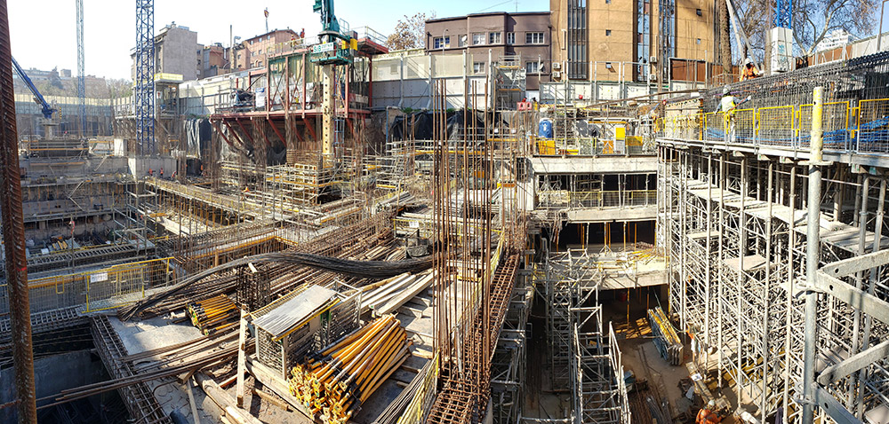 Para la ejecución de los muros y pilares se ha optado por sistemas de moldaje vertical robustos capaces de soportar grandes presiones de hormigonado como el moldaje modular ORMA que destaca por su gran rendimiento en obra, junto al moldaje modular ligero NEVI que ha supuesto la solución más adecuada para resolver las geometrías más complejas de este proyecto de edificación. Mientras que para la ejecución de losas el sistema elegido fue el del moldaje de losa con vigas metálicas BTM, un sistema sencillo, práctico y eficaz, que con pocos componentes puede adaptarse fácilmente a cualquier distribución.