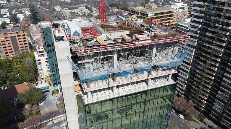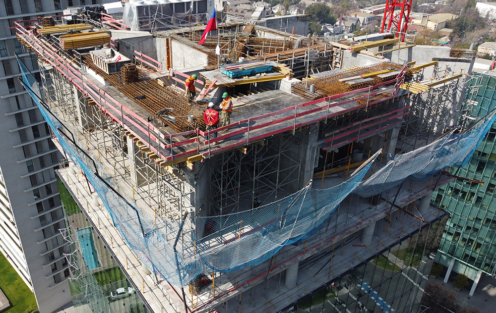 Al ser un edificio semi-colgado, el proyecto Gertrudis Echeñique requería de soluciones técnicas distintas a un edificio tradicional para solucionar particularidades como por ejemplo la quíntuple altura de 12 m de la losa del primer piso con puntos de apoyo para la cimbra desde el subterráneo 1 y 2 con una terminación de la losa tipo arquitectónica. Así, para ejecutar la losa del primer piso se recurrió a su apeo mediante la cimbra T-60 compuesta por marcos y diagonales que unidos entre sí forman torres de carga con una capacidad de soporte en torno a 60-65 KN por pie. Además, se utilizaron los puntales de aluminio ALUPROP que unidos mediante marcos de arriostramiento y configurados en modo de cimbra conforman una sistema ligero que ofrece a su vez una gran capacidad portante. La flexibilidad y la sencillez de aplicación en obra que ofrece el moldaje de losa con vigas metálicas BTM junto a elementos de seguridad como barandas especiales y mallas de seguridad, ha contribuido a la evolución óptima y segura del proceso de edificación.