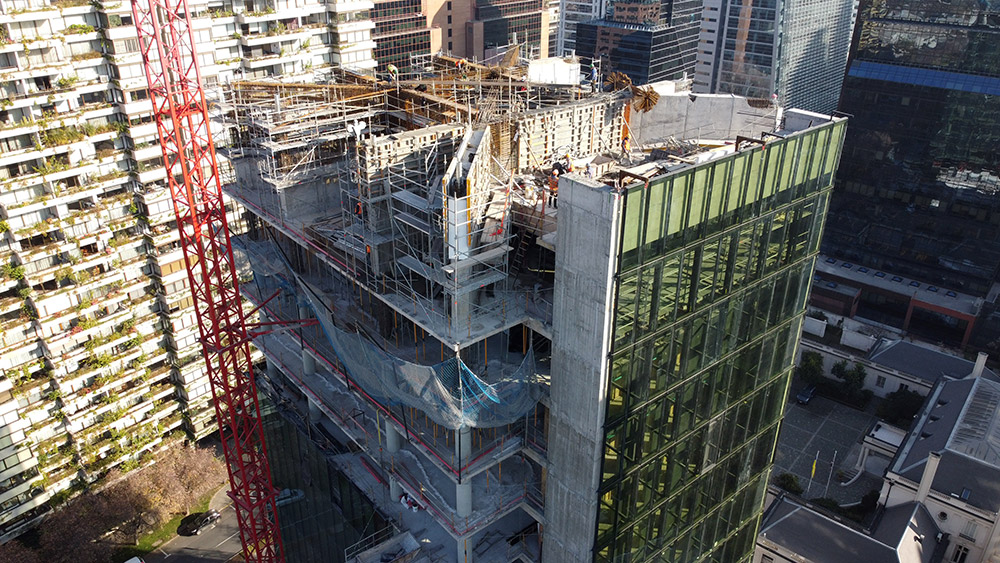 Debido a la alta congestión de acero en sus muros, se utilizó hormigón autocompactante para la ejecución del gran núcleo central del edificio. El uso de este tipo de hormigón generó una presión de hormigonado sobre las 6 tn/m² por lo que hubo que reforzar los muros ejecutados mediante el moldaje modular ORMA, perforando las placas fenólicas con pasadas de tirantes dywidag y riostras mk-120 como correas, lo cual permitió controlar las presiones de hormigonado.