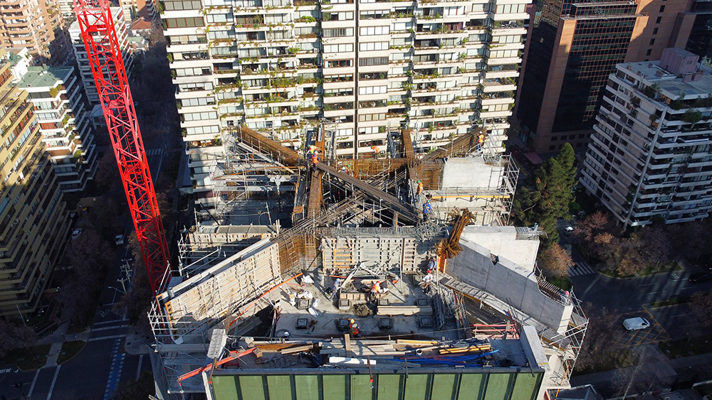 Los muros colgantes de 6,1 m de altura que visto en planta se proyectan en forma de asterisco, desde el núcleo central en el piso mecánico, se ejecutaron mediante el moldaje modular ligero NEVI, en primera etapa, para luego utilizar el moldaje modular ORMA en la segunda y tercera etapa permitiendo un mayor rendimiento en el proceso de hormigonado.
